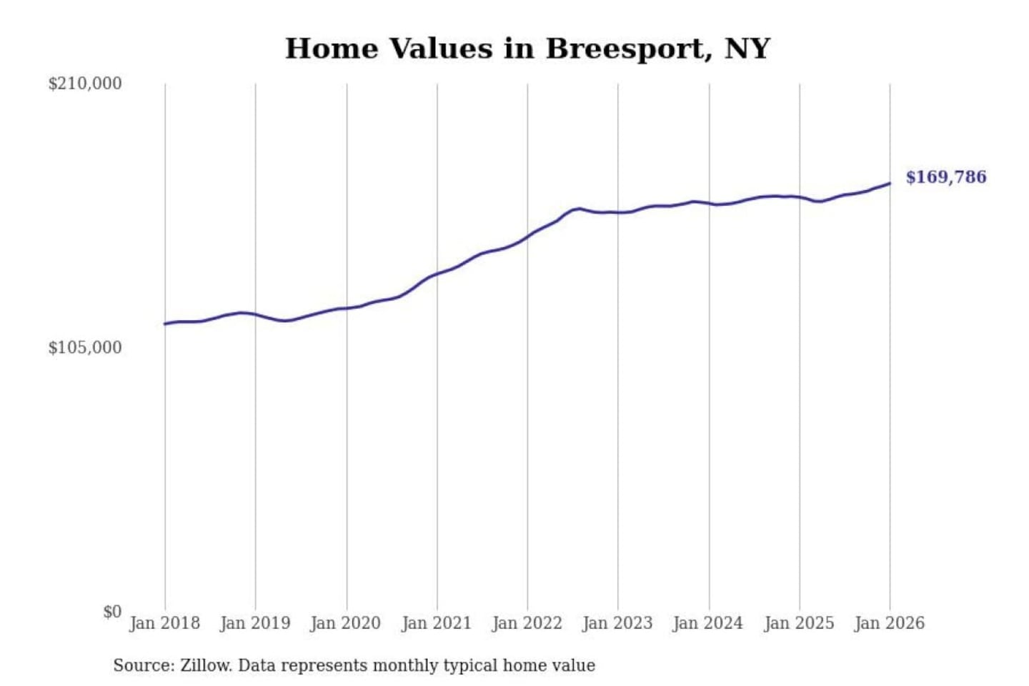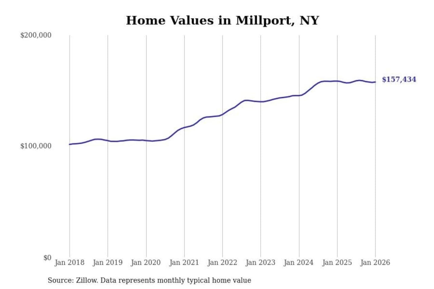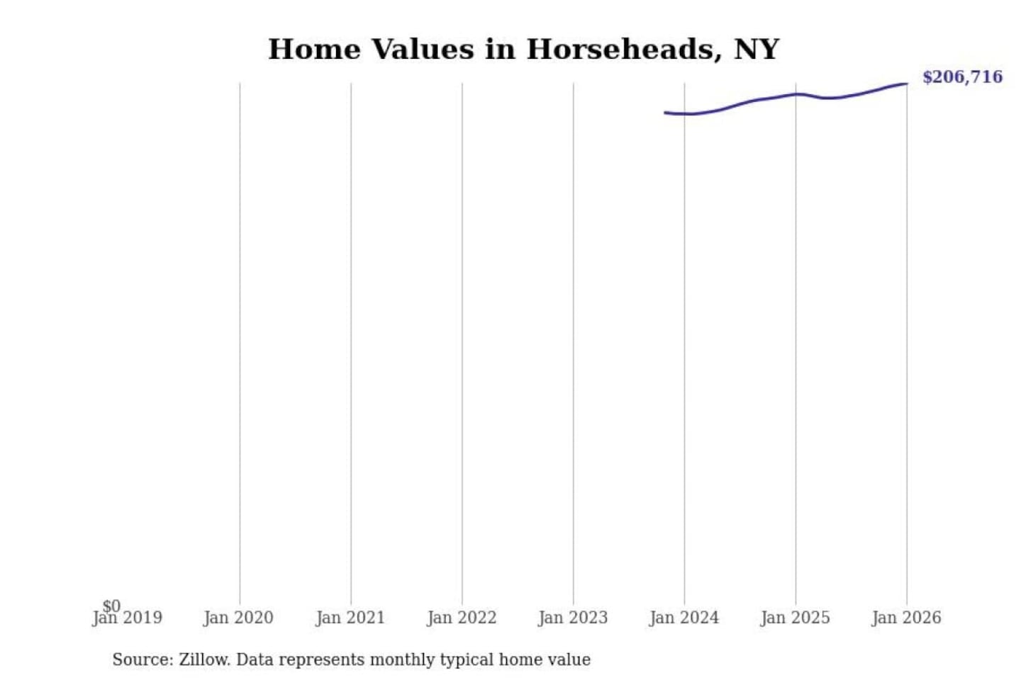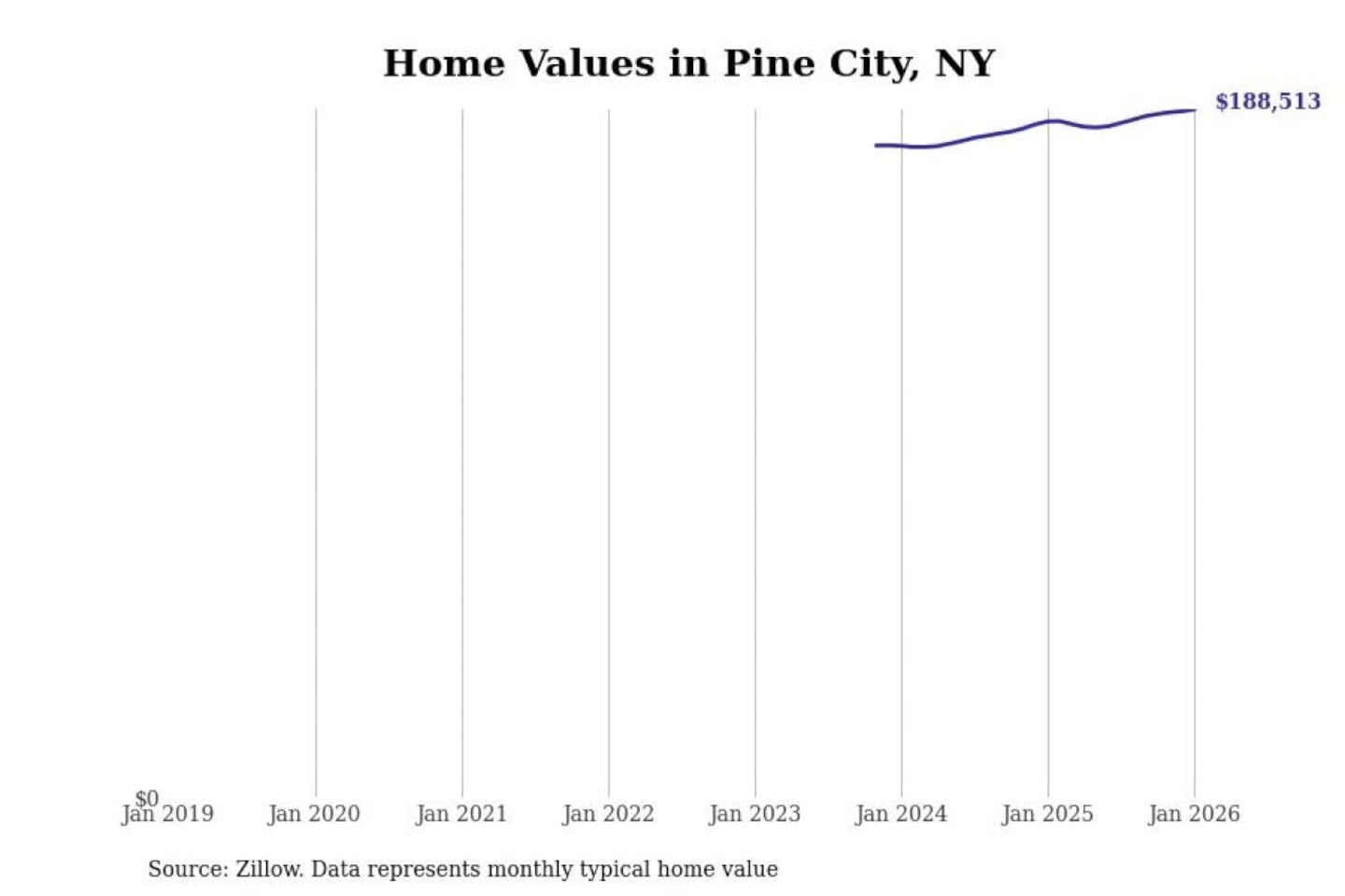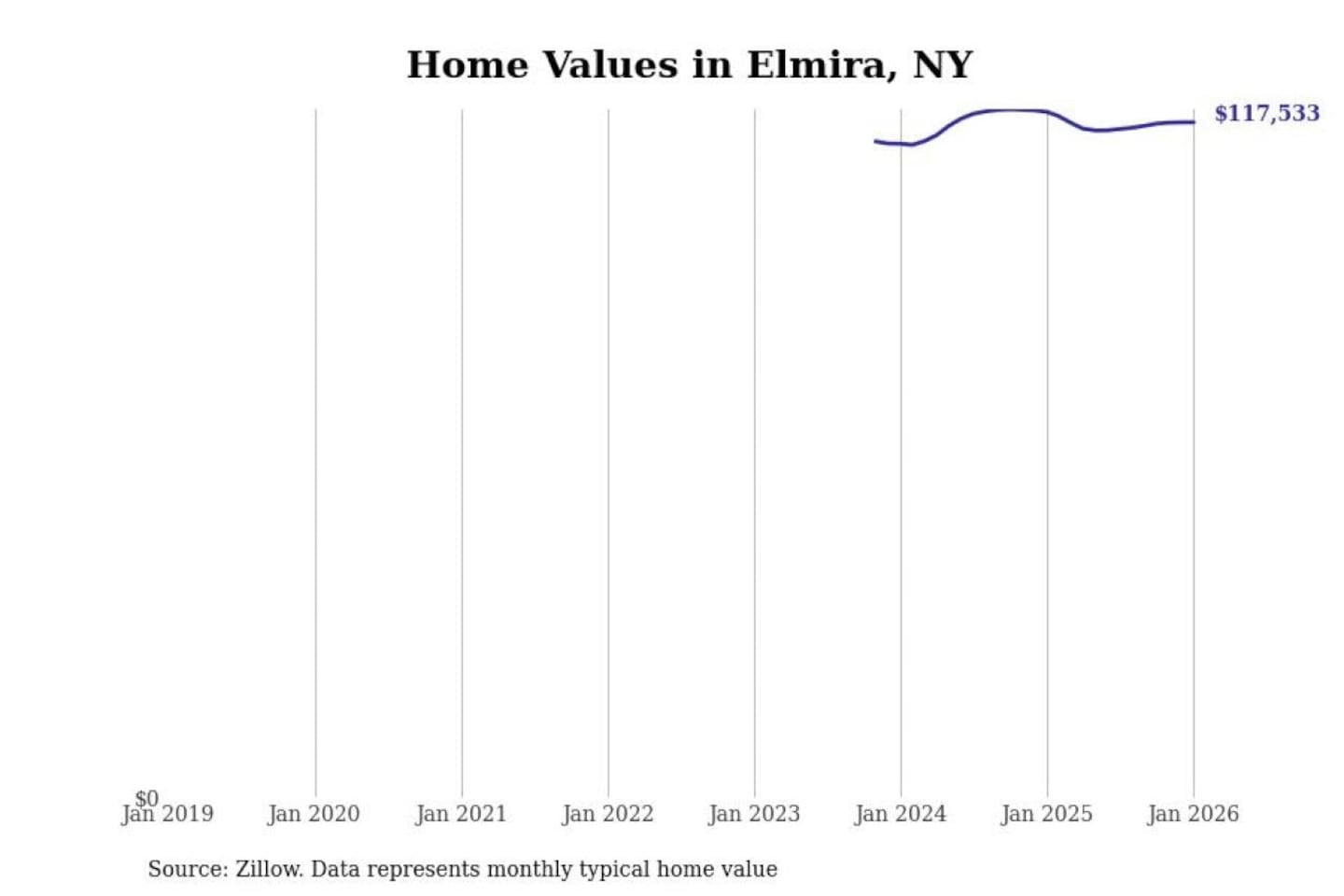 Stacker compiled a list of cities with the most expensive homes in the Elmira, NY metro area using data from Zillow. Charts show the monthly typical home value since January 2018.