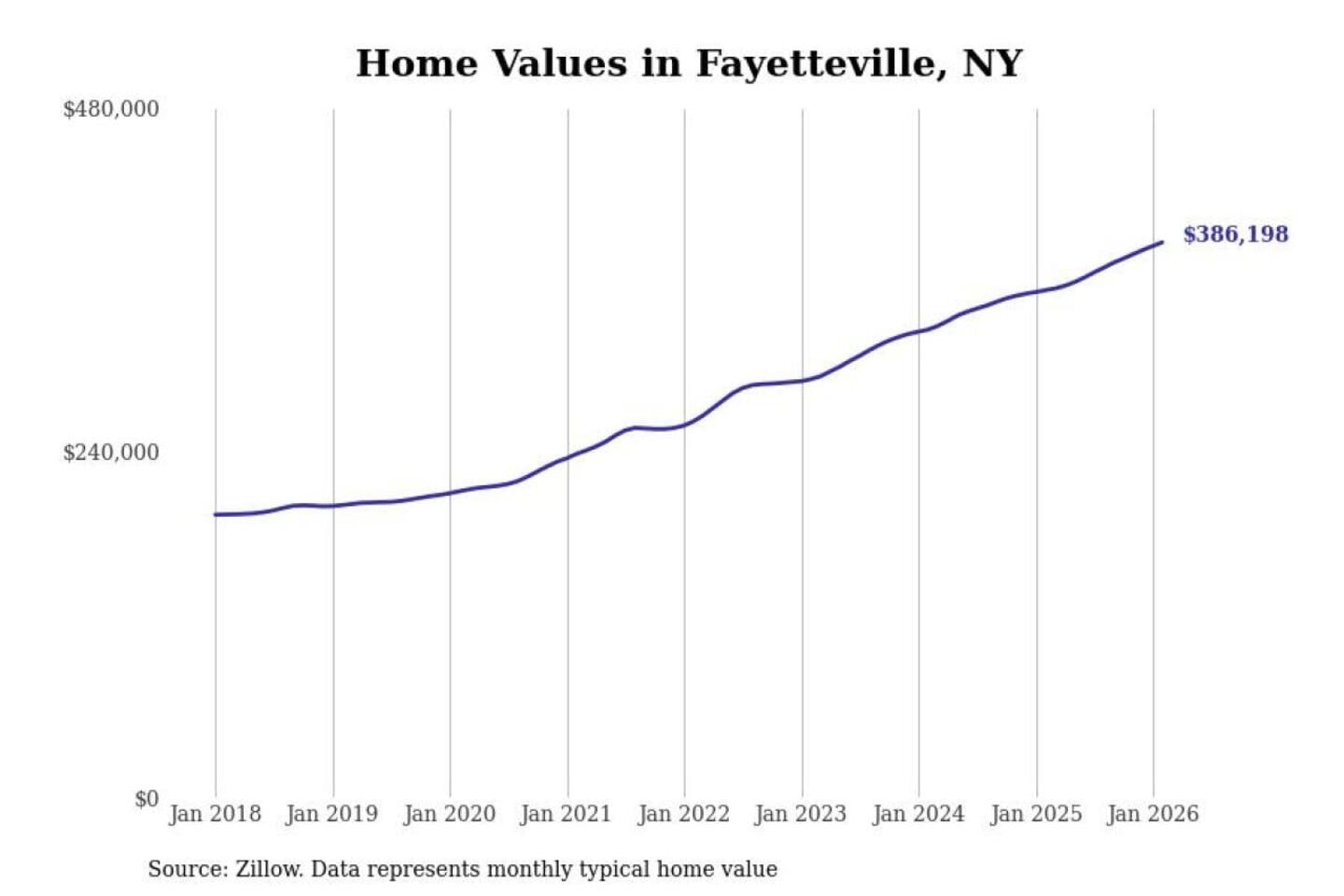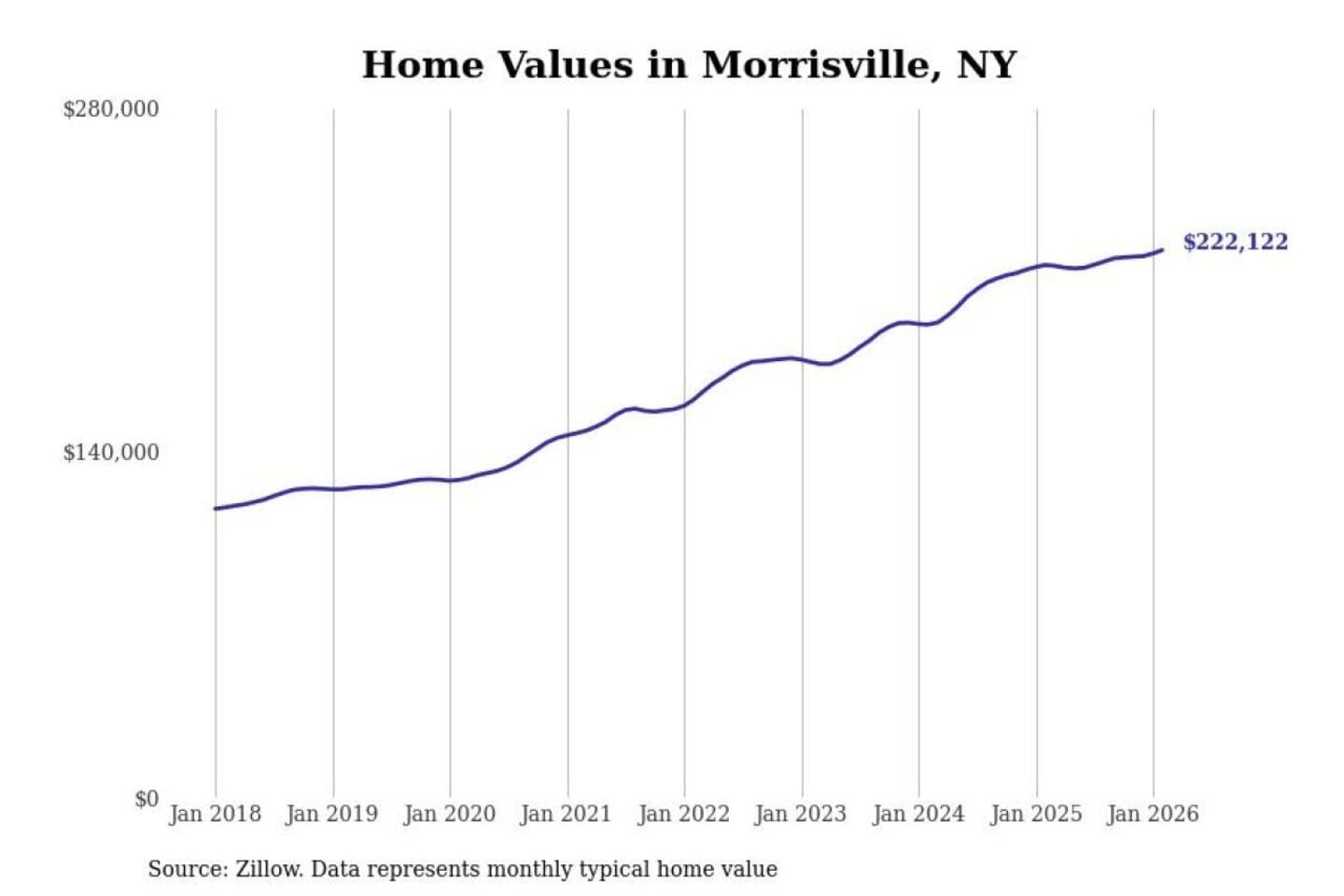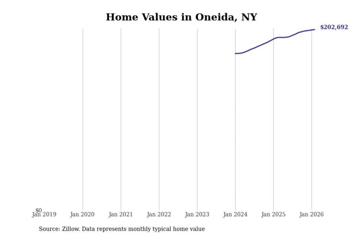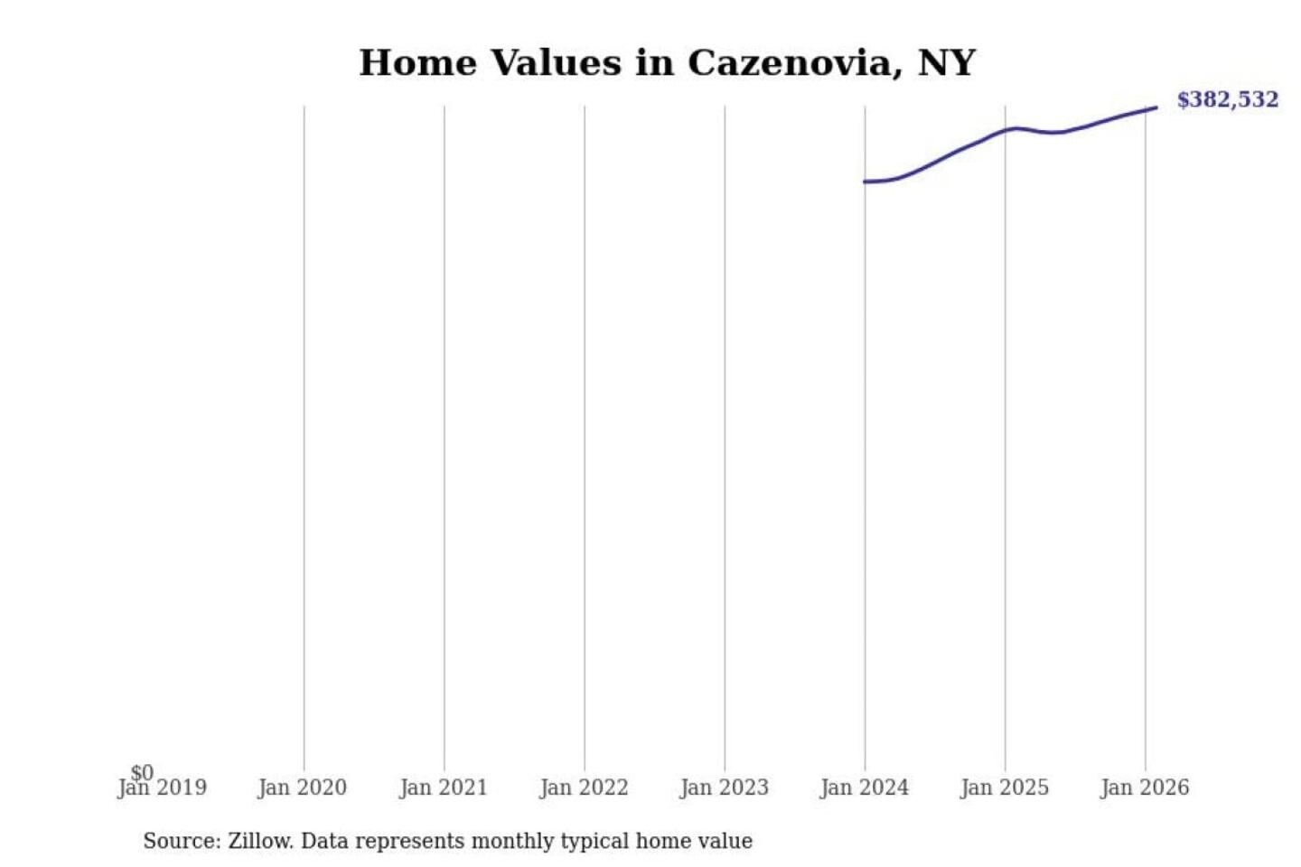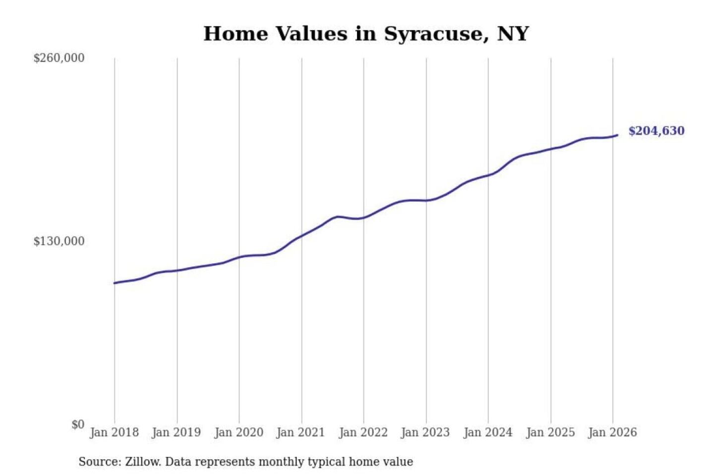 Stacker compiled a list of cities with the most expensive homes in the Syracuse, NY metro area using data from Zillow. Charts show the monthly typical home value since January 2018.