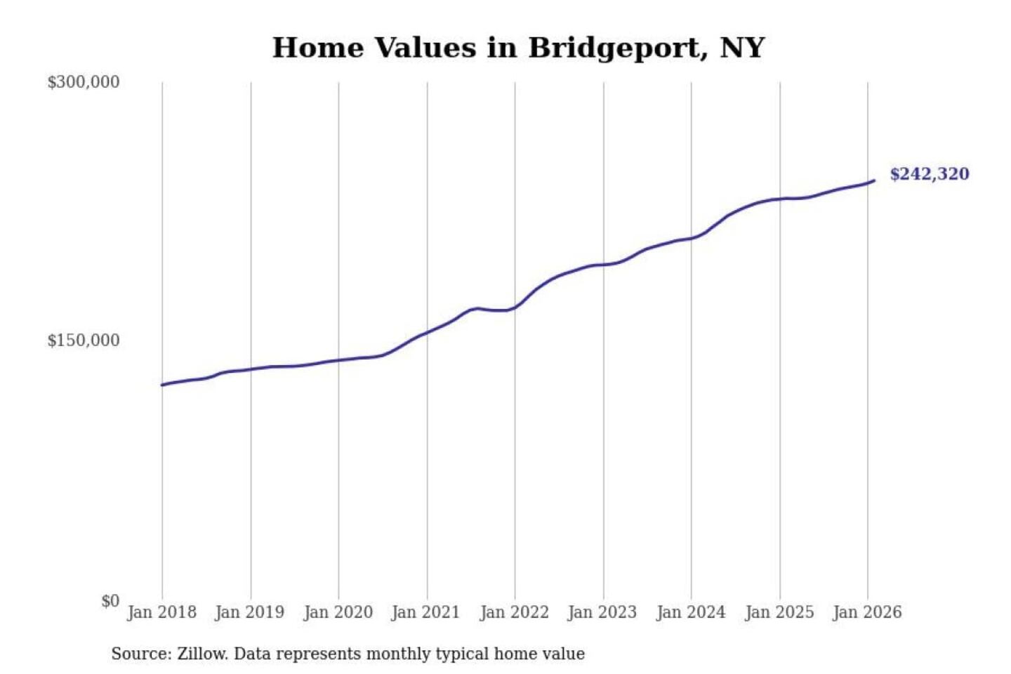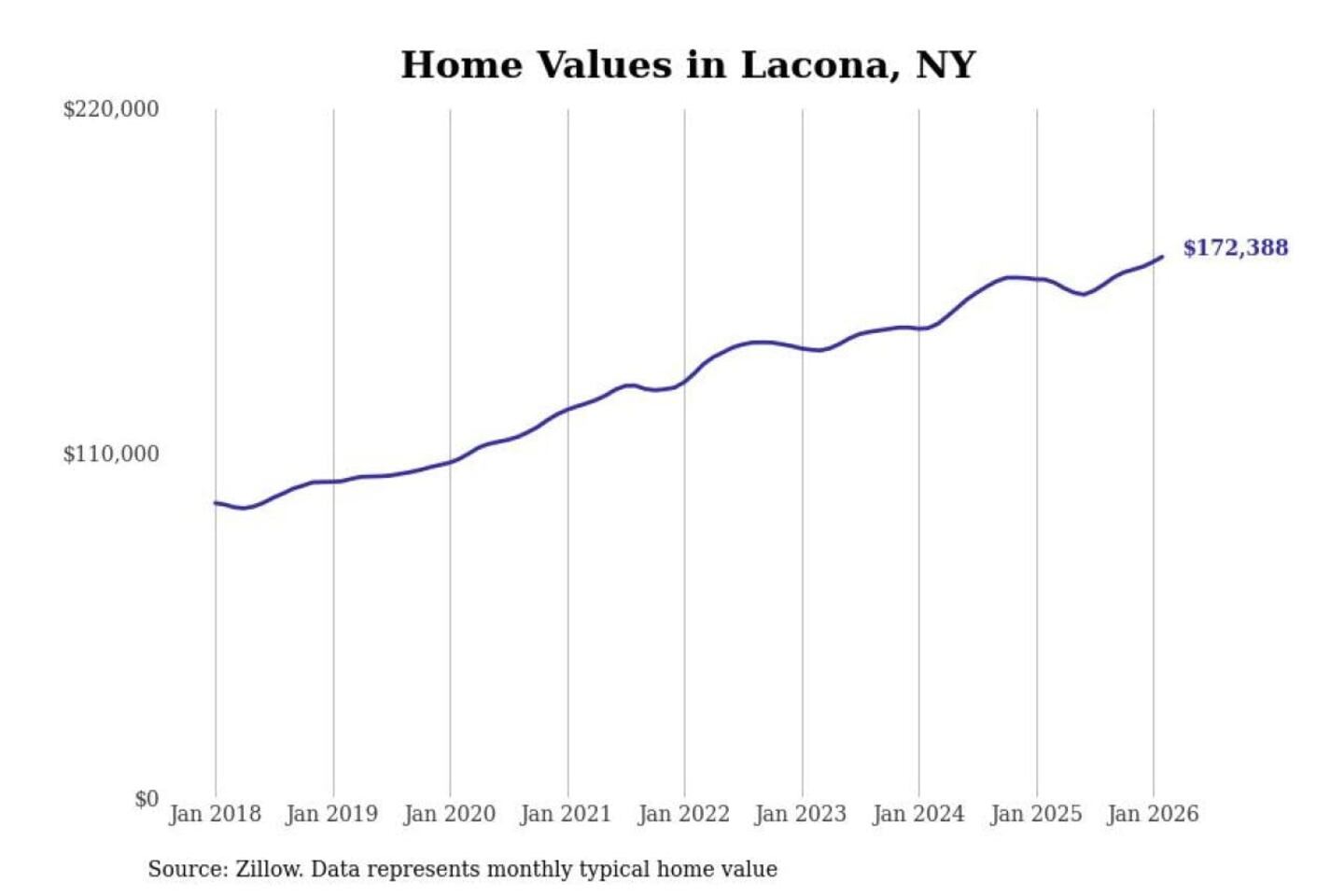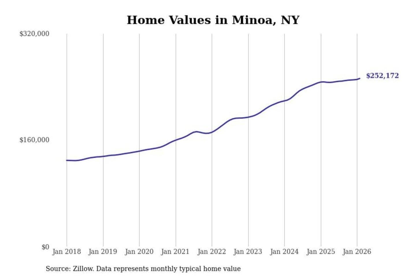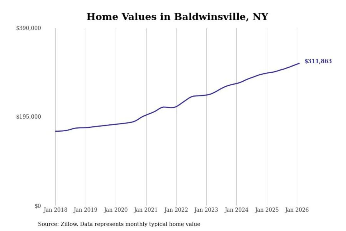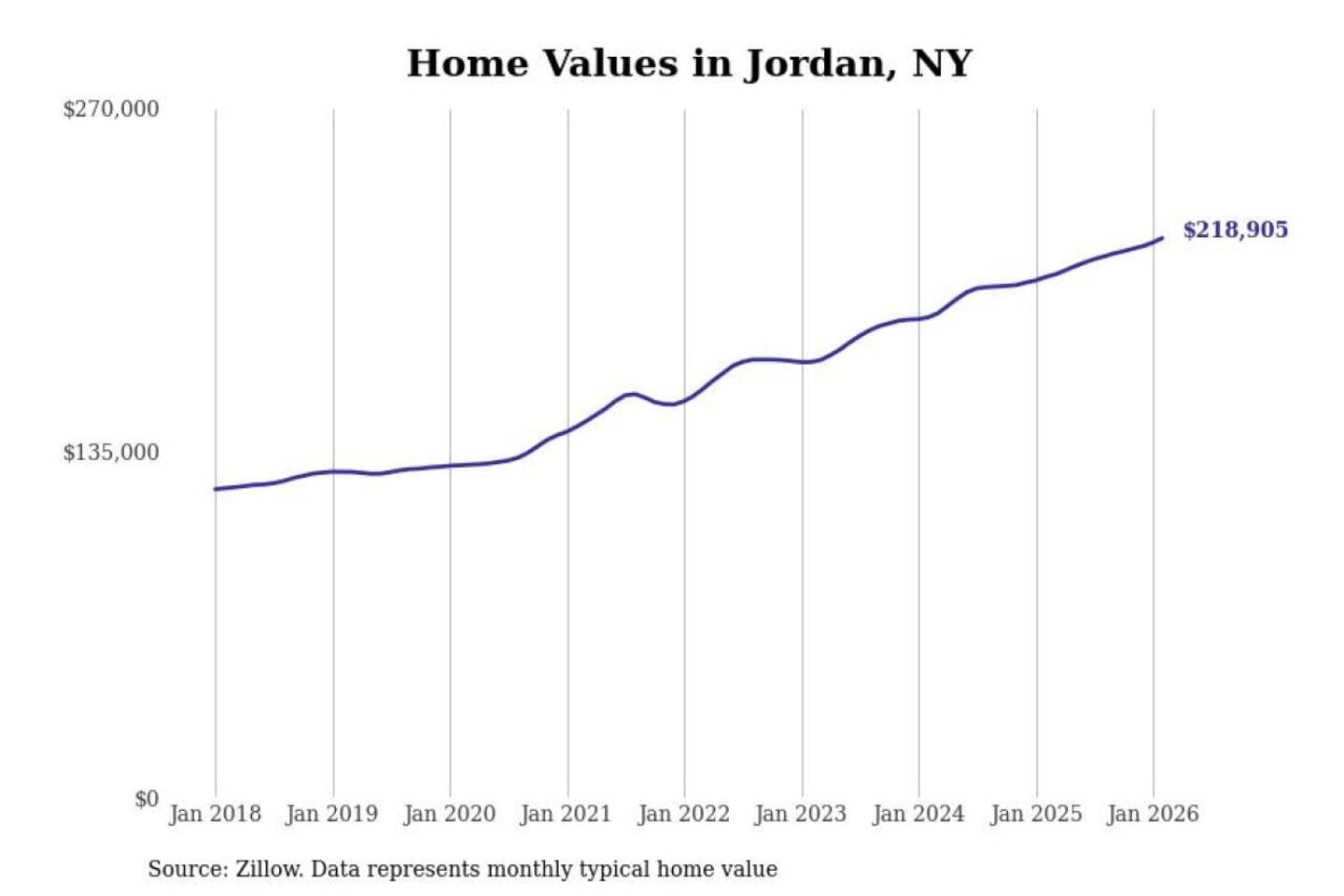 Stacker compiled a list of cities with the most expensive homes in the Syracuse, NY metro area using data from Zillow. Charts show the monthly typical home value since January 2018.