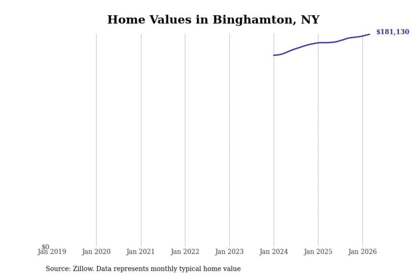 Stacker compiled a list of cities with the most expensive homes in the Binghamton, NY metro area using data from Zillow. Charts show the monthly typical home value since January 2018.