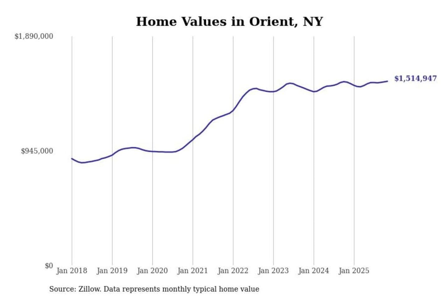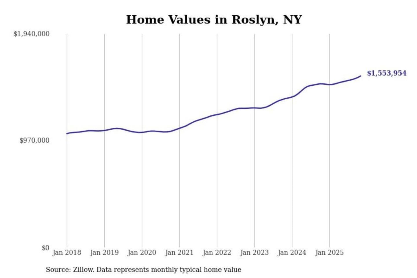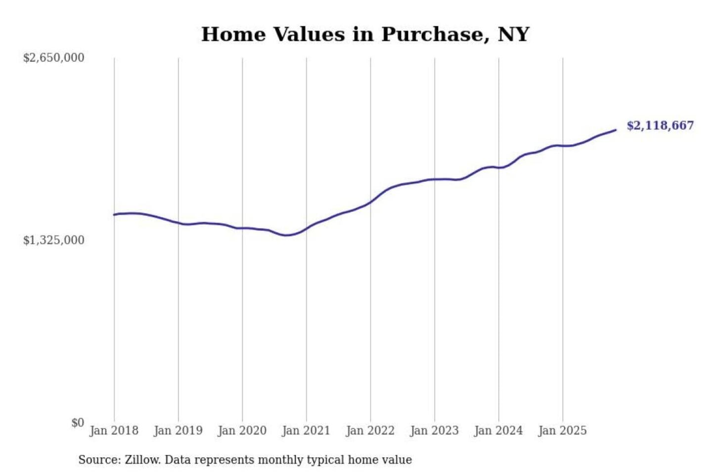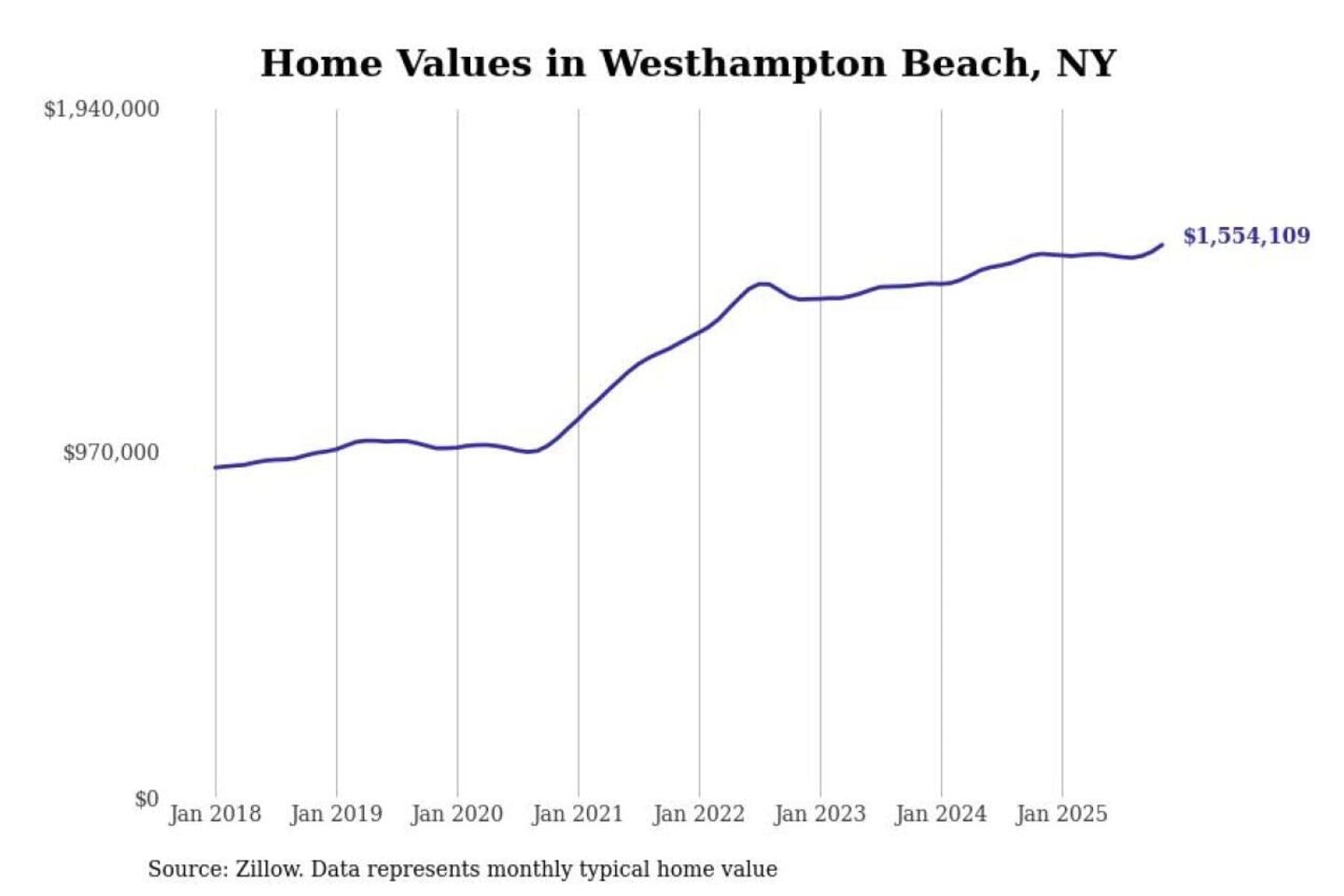Stacker compiled a list of cities with the most expensive homes in New York using data from Zillow. Cities are ranked by the Zillow Home Values Index for all homes as of November 2025. The charts in this story were created automatically using Matplotlib.