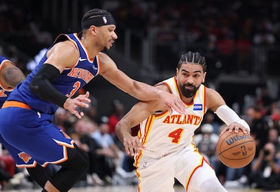 New York Knicks v Atlanta Hawks - Game Four ATLANTA, GEORGIA - APRIL 25: Gabe Vincent #4 of the Atlanta Hawks drives against Josh Hart #3 of the New York Knicks during the third quarter of game four of the Eastern Conference first round playoffs at State Farm Arena on April 25, 2026 in Atlanta, Georgia. NOTE TO USER: User expressly acknowledges and agrees that, by downloading and or using this photograph, User is consenting to the terms and conditions of the Getty Images License Agreement. (Photo by Kevin C. Cox/Getty Images) (Kevin C. Cox/Getty Images)