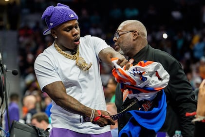 New York Knicks v Charlotte Hornets CHARLOTTE, NORTH CAROLINA - MARCH 26: Rapper DaBaby hits a New York Knicks jersey with a belt in the second half during the game between the Charlotte Hornets and the New York Knicks at Spectrum Center on March 26, 2026 in Charlotte, North Carolina. NOTE TO USER: User expressly acknowledges and agrees that, by downloading and or using this photograph, User is consenting to the terms and conditions of the Getty Images License Agreement. (Photo by Jacob Kupferman/Getty Images) (Jacob Kupferman/Getty Images)