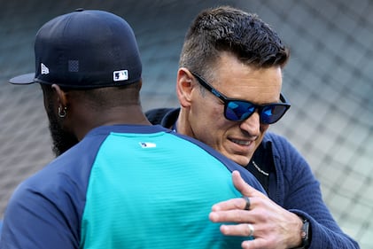 New York Yankees v Seattle Mariners SEATTLE, WASHINGTON - MARCH 30: President of baseball operations Jerry Dipoto of the Seattle Mariners hugs Randy Arozarena #56 of the Seattle Mariners during batting practice before the game against the New York Yankees at T-Mobile Park on March 30, 2026 in Seattle, Washington. (Photo by Steph Chambers/Getty Images) (Steph Chambers/Getty Images)