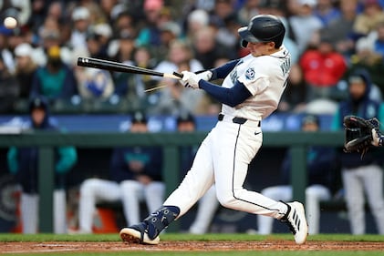 New York Yankees v Seattle Mariners SEATTLE, WASHINGTON - MARCH 30: Cole Young #2 of the Seattle Mariners breaks his bat on a single against the New York Yankees during the second inning at T-Mobile Park on March 30, 2026 in Seattle, Washington. (Photo by Steph Chambers/Getty Images) (Steph Chambers/Getty Images)